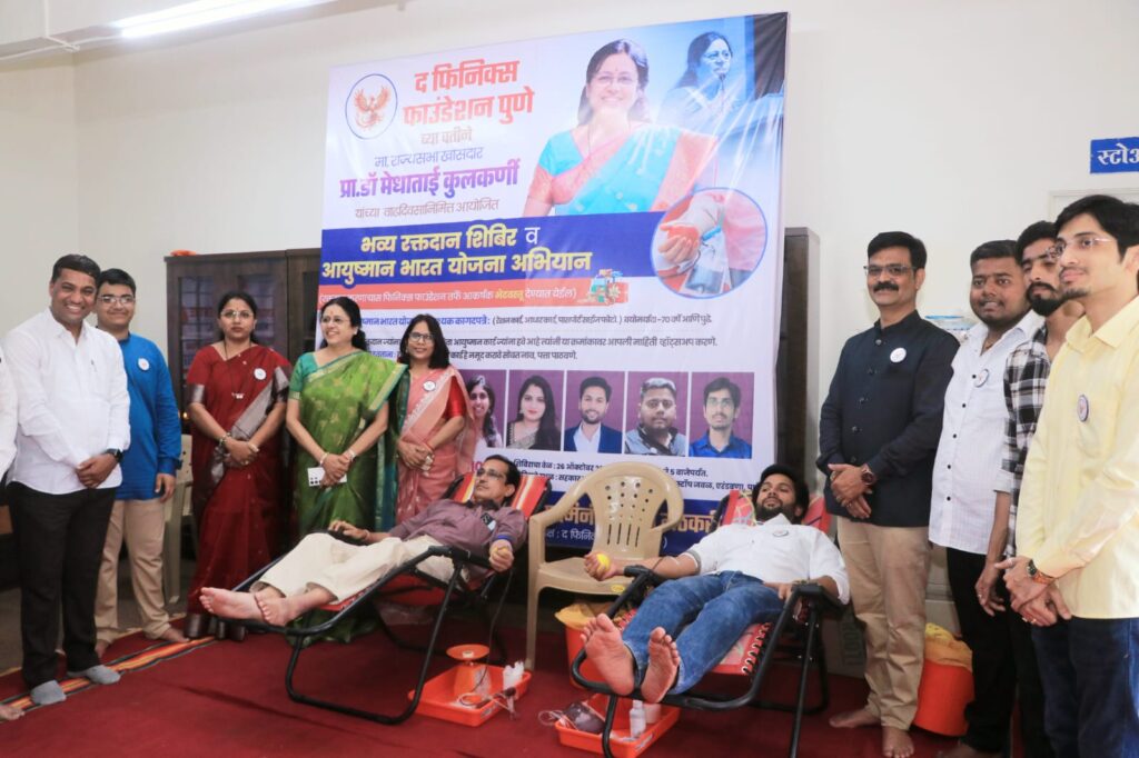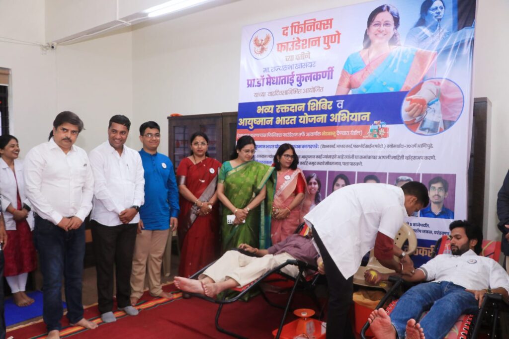Blood donation camp पुणे -खा.डॉ. सौ. मेधाताई कुलकर्णी यांच्या वाढदिवसाचे औचित्य साधत “द फिनिक्स फाउंडेशन” तर्फे पुण्यात भव्य रक्तदान शिबिर आणि आयुष्मान भारत योजना अभियान मोठ्या उत्साहात संपन्न झाले. या उपक्रमाला नागरिकांनी उत्स्फूर्त प्रतिसाद देत मोठ्या संख्येने रक्तदान केले. शिबिराचे आयोजन संस्थेच्या संस्थापक व अध्यक्षा यामिनी मठकरी यांच्या मार्गदर्शनाखाली करण्यात आले होते.