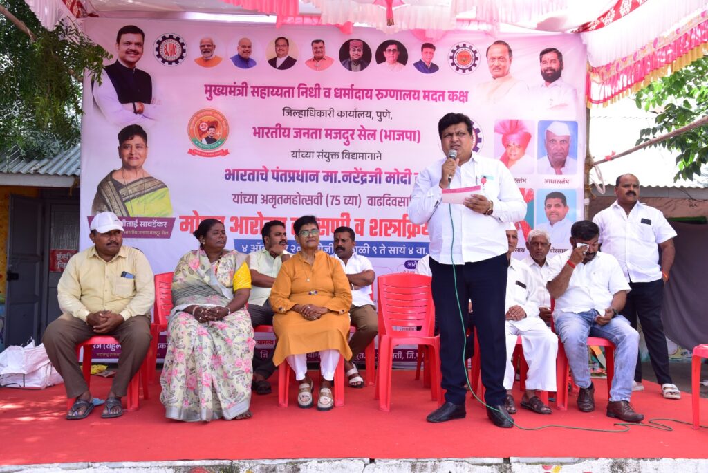 भारताचे पंतप्रधान मा. नरेंद्रजी मोदी यांच्या अमृतमहोत्सवी वाढदिवसानिमित्त, मुख्यमंत्री सहायता निधी व धर्मादाय रुग्णालय मदत कक्ष, जिल्हाधिकारी कार्यालय पुणे आणि भारतीय जनता मजदूर सेल यांच्या संयुक्त विद्यमाने मौजे निंबुत (ता. हवेली, जि. पुणे) येथे भव्य मोफत आरोग्य तपासणी व शस्त्रक्रिया शिबिराचे आयोजन करण्यात आले. ग्रामीण जनतेला सर्वसमावेशक आणि मोफत आरोग्यसेवा पुरविण्याच्या उद्देशाने आयोजित या शिबिराला नागरिकांचा उत्स्फूर्त प्रतिसाद लाभला.