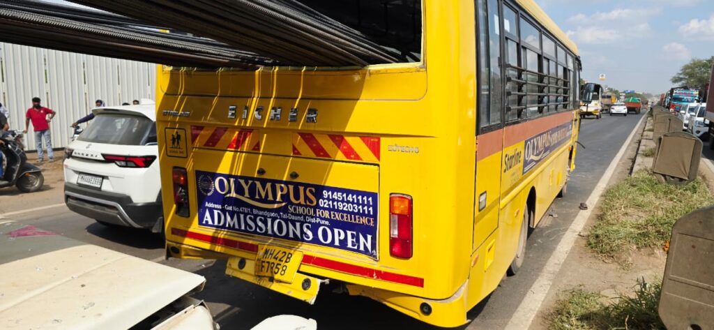पुणे- सोलापूर महामार्गावर भीषण अपघात; लोखंडी सळ्या थेट स्कूलबसमध्ये घुसल्या