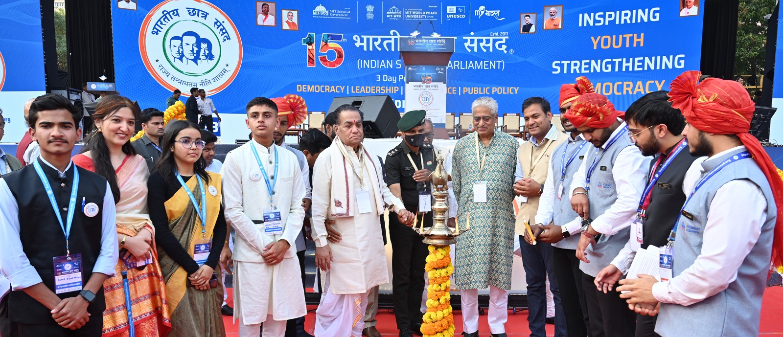 याप्रसंगी मध्यप्रदेशचे माजी मुख्यमंत्री व राज्यसभेचे खासदार दिग्विजय सिंह, वरिष्ठ पत्रकार व लेखक पद्मश्री राजदीप सरदेसाई आणि जर्मनीच्या हॅम्बुर्ग येथील हवामान बदल व्यवस्थापनाचे प्रा. वॉल्टर लील फिल्हो हे सन्माननीय पाहुणे म्हणून उपस्थित होते. तसेच भारतीय छात्र संसदेचे संस्थापक व एमआयटी डब्ल्यूपीयूचे कार्याध्यक्ष डॉ.राहुल विश्वनाथ कराड, कुलगुरू डॉ. आर. एम. चिटणीस, विद्यार्थी प्रतिनिधी सुमित खैरे, पायल झा, निखिल मिश्रा आणि अक्षिता सक्सेना उपस्थित होते.