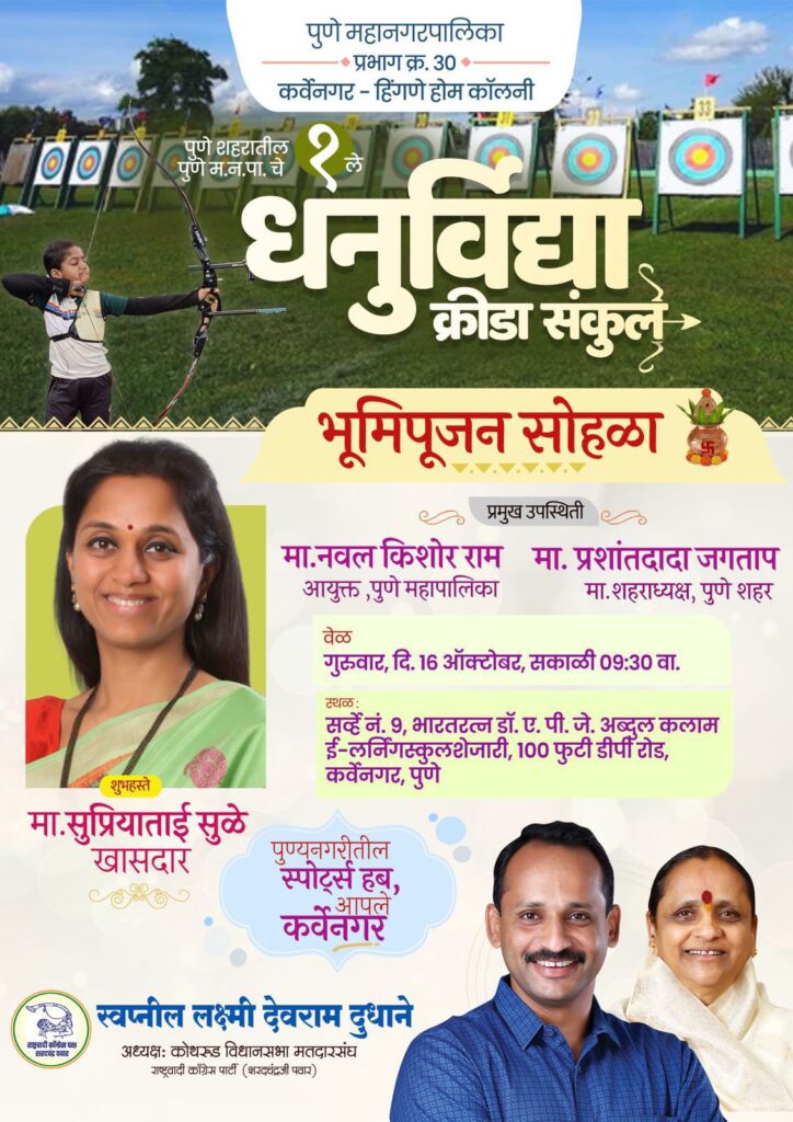 पुणे/ कोथरूड : कर्वेनगर प्रभागात सुरू होत असलेला पुणे महापालिकेच्या पहिल्या धनुर्विद्या क्रीडा संकुलचा भूमिपूजन सोहळा येत्या 16 ऑक्टोबर रोजी राष्ट्रवादी कॉँग्रेसच्या नेत्या, खासदार सुप्रिया सुळे यांच्या हस्ते पार पडणार आहे अशी माहिती कोथरुड विधानसभा अध्यक्ष स्वप्निल दुधाने यांनी प्रसिद्धी पत्रकाद्वारे दिली आहे.