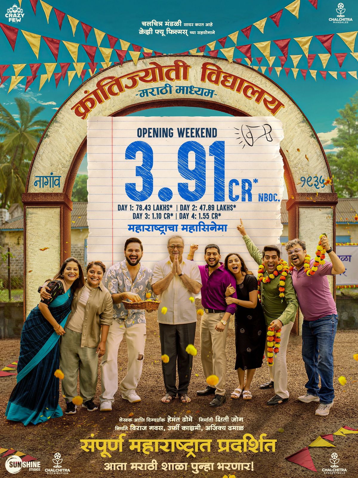मराठी शाळेच्या अस्मितेला नवा आवाज देणारा ‘क्रांतिज्योती विद्यालय – मराठी माध्यम’ हा चित्रपट प्रेक्षकांच्या भेटीला आला असून, प्रदर्शित होताच चित्रपटगृहांमध्ये जल्लोषाचे वातावरण निर्माण झाले आहे. संपूर्ण महाराष्ट्रभर या चित्रपटाची जोरदार चर्चा सुरू आहे. तसेच सोशल मीडियावर व बुक माय शोवर चित्रपट ट्रेंडिंग ठरत आहे. या चित्रपटाने पहिल्याच वीकेंडला तब्बल ३.९१ कोटींचा गल्ला जमवला आहे. जोरदार कमाई करत हा चित्रपट बॉक्स ऑफिसवर धुमाकूळ घालत आहे.