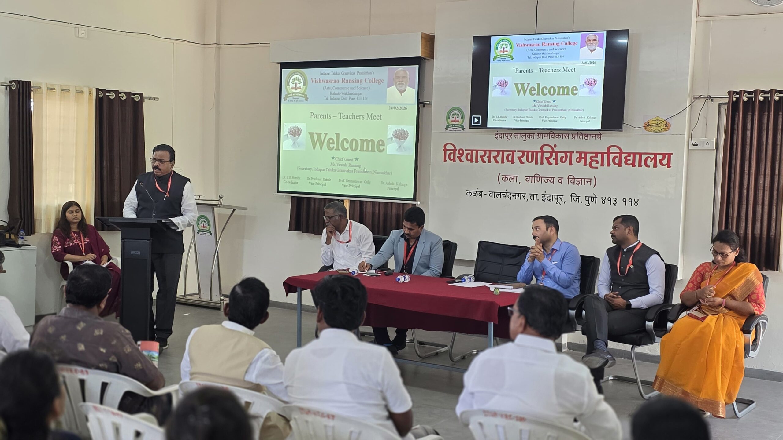 इंदापूर तालुका ग्रामविकास प्रतिष्ठानचे विश्वासराव रणसिंग महाविद्यालय, कळंब–वालचंदनगर येथे पालक शिक्षक संवाद सभा संपन्न झाली.संस्था सचिव वीरसिंह रणसिंग यांच्या मार्गदर्शनाखाली सभेचे आयोजन करण्यात आले होते.विद्यार्थ्यांच्या शैक्षणिक प्रगतीत पालक व शिक्षक यांचा समन्वय अधिक प्रभावी व्हावा,नवीन राष्ट्रीय शैक्षणिक धोरण तसेच महाविद्यालयात विद्यार्थ्यांच्या सर्वांगीण विकासासाठी घेण्यात येणारे विविध शैक्षणिक व सहशैक्षणिक उपक्रमांची माहिती,महाविद्यालयात सुरू करण्यात येणाऱ्या नवीन अभ्यासक्रमाची माहिती तसेच विद्यार्थ्यांच्या प्रवासाची गैरसोय पाहता सुरुकरण्यात येणारी बससुविधा इत्यादी बाबी पालकांपर्यंत पोहचविणे या उद्देशाने या संवाद सभेचे आयोजन करण्यात आले असल्याचे प्राचार्य डॉ.अशोक काळंगे यांनी सांगितले. समन्वयक डॉ. तेजश्री हुंबे यांनी पालक–शिक्षक संवादाचे शैक्षणिक, सामाजिक व भावनिक महत्त्व अधोरेखित करत, विद्यार्थ्यांच्या सर्वांगीण विकासासाठी पालक आणि शिक्षक यांच्यातील सातत्यपूर्ण संवाद अत्यावश्यक असल्याचे नमूद केले.