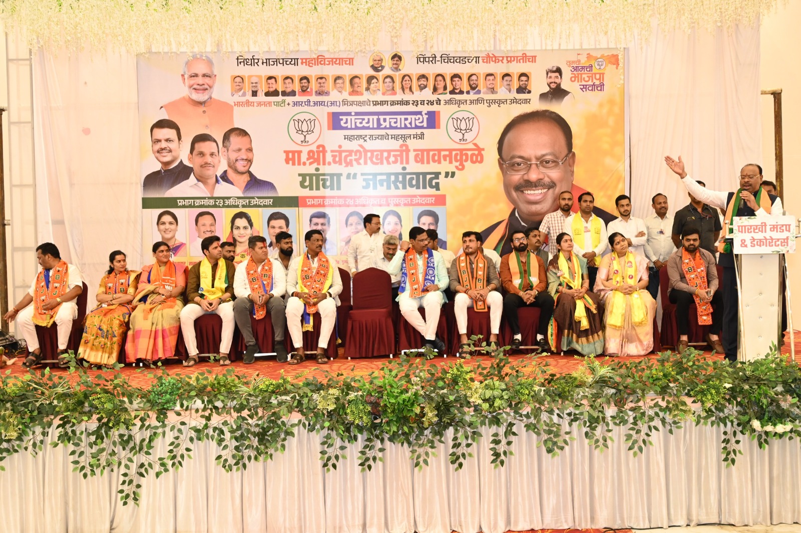 पिंपरी चिंचवड महापालिका सार्वत्रिक निवडणूक 2026 च्या निमित्ताने प्रभाग 17, 23 आणि 24 येथील उमेदवारांसाठी वाल्हेकरवाडी आणि थेरगाव येथे जनसंवाद बैठकीचे आयोजन करण्यात आले होते. या बैठकीमध्ये महसूल मंत्री चंद्रशेखर बावनकुळे यांनी मार्गदर्शन केले. यावेळी पिंपरी चिंचवड निवडणूक प्रमुख तथा आमदार शंकर जगताप उपस्थित होते. दरम्यान सभेसाठी प्रभाग 17 मधील आशा सूर्यवंशी, नामदेव ढोके, पल्लवी वाल्हेकर, सचिन चिंचवडे तर प्रभाग 23 मधील मनीषा प्रमोद पवार, तानाजी बारणे, सोनाली गाडे, अभिषेक बारणे आणि प्रभाग 24 मधील उमेदवार सिद्धेश्वर बारणे, करिष्मा बारणे, गणेश गुजर आणि शालिनी गुजर हे उमेदवार उपस्थित होते.