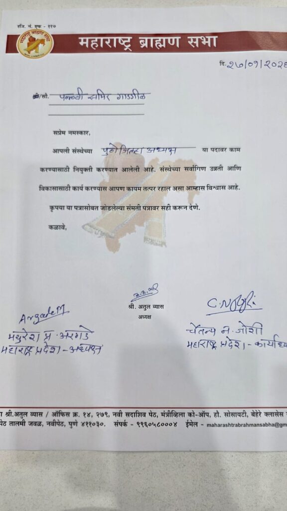 महाराष्ट्र ब्राह्मण सभेच्या पुणे जिल्हा अध्यक्षपदी सौ. पल्लवी गाडगीळ यांची निवड