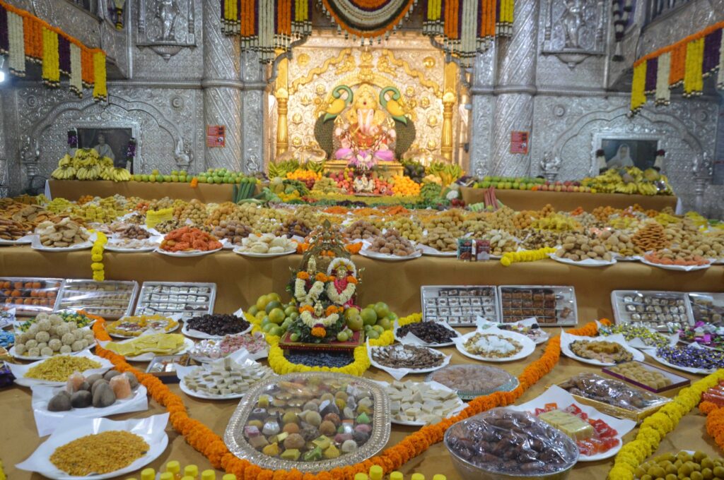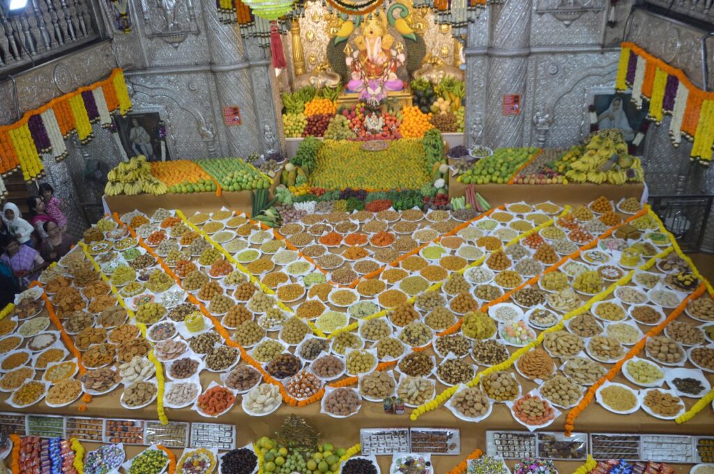 पुणे : त्रिपुरारी पौर्णिमेनिमित्त श्रीमंत दगडूशेठ गणपती मंदिरात लाडक्या गणरायासमोर अन्नकोट साकारत ५२१ पदार्थांचा महानैवेद्य दाखविण्यात आला. मिठाई, फराळाच्या तिखट-गोड पदार्थांपासून विविध प्रकारच्या फळांची करण्यात आलेली आकर्षक आरास आणि विविध रसास्वादाचे पदार्थ बाप्पाला अर्पण करण्यात आले.