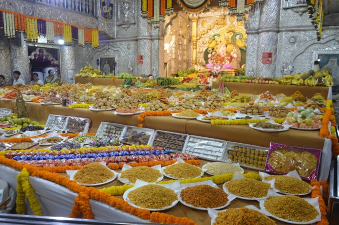 पुणे : त्रिपुरारी पौर्णिमेनिमित्त श्रीमंत दगडूशेठ गणपती मंदिरात लाडक्या गणरायासमोर अन्नकोट साकारत ५२१ पदार्थांचा महानैवेद्य दाखविण्यात आला. मिठाई, फराळाच्या तिखट-गोड पदार्थांपासून विविध प्रकारच्या फळांची करण्यात आलेली आकर्षक आरास आणि विविध रसास्वादाचे पदार्थ बाप्पाला अर्पण करण्यात आले.