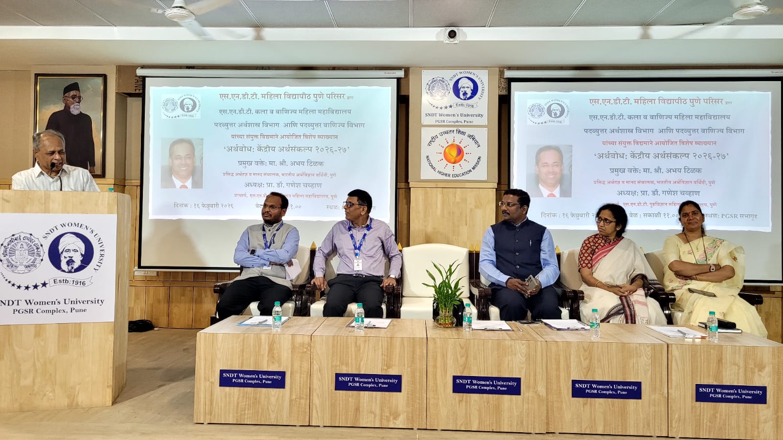 आपल्या अध्यक्षीय भाषणातून प्राचार्य डॉ. चव्हाण यांनी समाजातील सर्व घटकांसानी अर्थसंकल्प समजावून घेण्याची गरज उद्धृत केली. तत्पूर्वी, पदव्युत्तर अर्थशास्त्र विभागप्रमुख डॉ. सुभाष पाटील यांनी प्रास्ताविक मनोगतातून व्याख्यानाच्या आयोजनाची भूमिका स्पष्ट केली. उपप्राचार्य डॉ. मृणालिनी घाडगे यांनी उपस्थितांचे आभार मानले. व्यासपीठावर मान्यवरांसह पदव्युत्तर वाणिज्य विभागप्रमुख डॉ. अशोक कोकाटे तसेच डॉ. प्रमिला पाटील उपस्थित होत्या. कार्यक्रमास एसएनडीटी पुणे आवारातील विभागप्रमुख, प्राध्यापक, शिक्षकेतर कर्मचारी, तसेच विद्यार्थिनी मोठ्या संख्येने उपस्थित होत्या.
