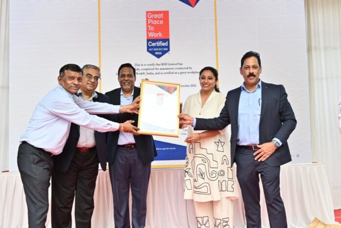 पुणे: पंप,व्हॉल्व्ह आणि संबंधित प्रणाली क्षेत्रातील आघाडीची जागतिक कंपनी केएसबी लिमिटेडला जीपीटीडब्ल्यूने (GPTW) “ग्रेट प्लेस टू वर्क” प्रमाणपत्र देऊन सन्मानित केले आहे. ही प्रतिष्ठित मान्यता कंपनीची उत्कृष्ट कार्य संस्कृती,पारदर्शकता आणि कर्मचाऱ्यांचे समाधान दर्शवते. जीपीटीडब्ल्यू(GPTW)ही एक आंतरराष्ट्रीय संस्था आहे जी कर्मचाऱ्यांच्या अनुभव आणि कार्य संस्कृतीच्या आधारे जगभरातील कंपन्यांचे मूल्यांकन करते.ती विश्वास,पारदर्शकता,स्वच्छता आणि कर्मचारी सहभाग या मूल्यांमध्ये उत्कृष्ट कामगिरी करणाऱ्या संस्थांची निवड करते. केएसबीने “KSB Limited is a Great Place to Work”या विधानावर प्रभावी91%गुणमिळवले असून,सर्व मापदंडांवर सरासरी89%गुणप्राप्त केले आहेत. कंपनीचे व्यवस्थापकीय संचालकश्री.राजीव जैन, उपाध्यक्ष – मानव संसाधन (HRD) –आशिया पश्चिम श्री. मोहन पाटील तसेच व्यवस्थापन टीम आणि कर्मचारी यांच्या उपस्थितीत झालेल्या एका विशेष समारंभात हे प्रमाणपत्र प्रदान करण्यात आले.