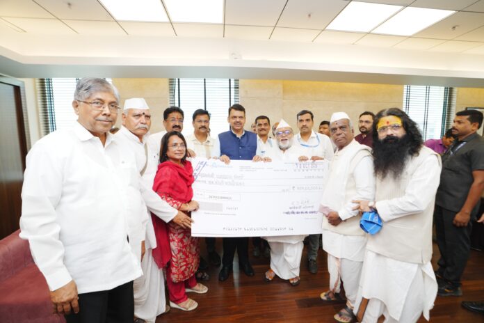 मुंबई दि.- राज्यातील विविध भागांमध्ये झालेल्या अतिवृष्टी व पूरस्थितीमुळे मोठ्या प्रमाणात शेत पिकांचे नुकसान झाले आहे. अतिवृष्टी व पूरस्थितीमुळे बाधित झालेल्या नागरिकांना मोठ्या संकटांना सामोरे जावे लागत आहे. पूरग्रस्तांना मदत करण्याचे आवाहन मुख्यमंत्री देवेंद्र फडणवीस यांनी राज्यातील सर्व देवस्थानांना केले होते.या आवाहनास प्रतिसाद देत तसेच सामाजिक उत्तरदायित्व व मानवतावादी भूमिकेतून श्री विठ्ठल-रुक्मिणी मंदिर समितीने शासनाची मंजुरी घेऊन मुख्यमंत्री सहायता निधीस एक कोटी रुपयाच्या मदतीचा धनादेश दिनांक 14 ऑक्टोबर रोजी मंत्रालय येथे मुख्यमंत्री देवेंद्र फडणवीस यांच्याकडे जमा केल्याची माहिती मंदिर समितीचे सह अध्यक्ष गहिनीनाथ महाराज औसेकर यांनी दिली.