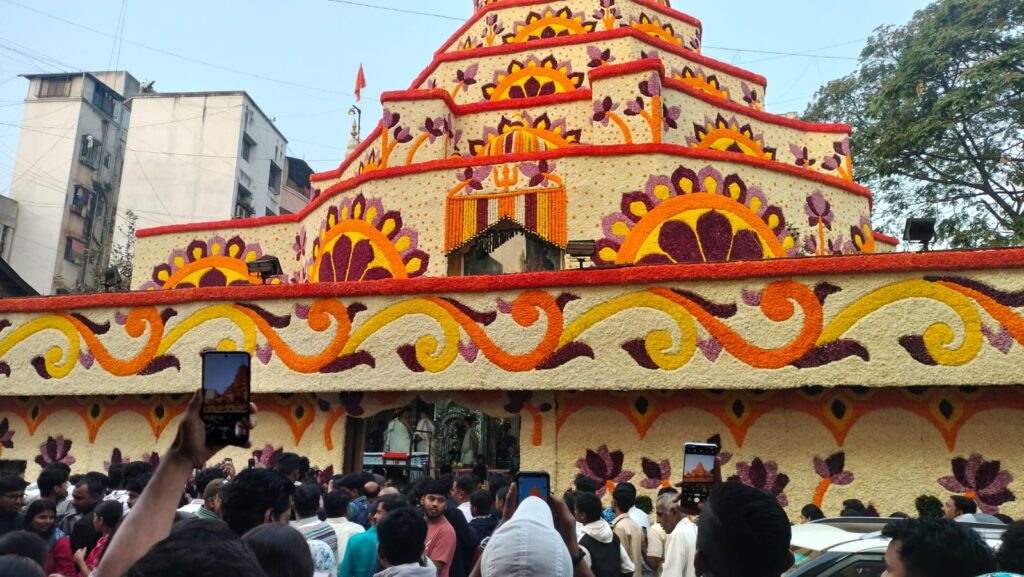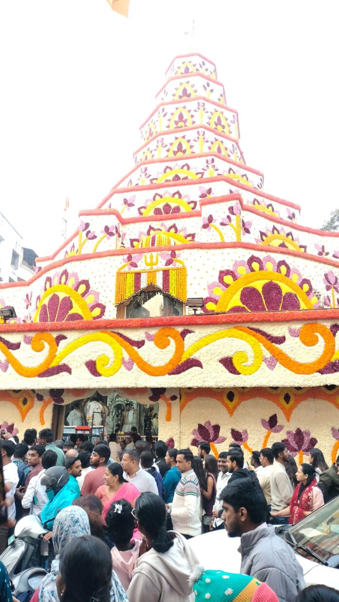 पुणे : ओम् गं गणपतये नम :…गणपती बाप्पा मोरया… जय गणेश… मंगलमूर्ती मोरया… अशा गणेश नामाच्या जयघोषाने ‘दगडूशेठ’ गणपती मंदिराचा परिसर दुमदुमून गेला. नववर्षातील पहिला अंगारकी संकष्टी चतुर्थी योग असल्याने भाविकांनी दगडूशेठ गणपतीच्या दर्शनासाठी पहाटेपासूनच मोठी गर्दी केली. मंदिराच्या कळसापासून ते गाभा-यापर्यंत विविधरंगी फुलांनी केलेली पारंपरिक आकर्षक पुष्पसजावट आणि विद्युतरोषणाने संपूर्ण श्रीमंत दगडूशेठ हलवाई गणपती मंदिर ‘दगडूशेठ’ गणपती मंदिराला अंगारकीनिमित्त भव्य पारंपरिक पुष्पआरास उजळून निघाले होते.
