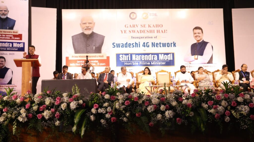 पुणे, -: प्रधानमंत्री नरेंद्र मोदी यांच्या हस्ते आत्मनिर्भर भारत योजनेंतर्गत संपूर्ण स्वदेशी बनावटीच्या ‘4G’ तंत्रज्ञानाधारित सेवेचे लोकार्पण झारसुगुडा ओडिशा येथून दूरदृष्य प्रणालीद्वारे झाले. याअंतर्गत बीएसएनएलच्या ९२ हजार ६३३ टॉवर्सचे लोकार्पण झाले असून, यापैकी ९ हजार २० टॉवर्स महाराष्ट्रात उभारले गेले आहेत. या माध्यमातून देशातील तसेच राज्यातील लाखो लोकांपर्यंत 4जी तंत्रज्ञान पोहोचणार असून महाराष्ट्र शासनाच्या अकराशे ऑनलाईन सेवा गावागावात पोहोचण्यात या कनेक्टिव्हिटीचा फायदा होणार आहे, असे मुख्यमंत्री देवेंद्र फडणवीस यांनी सांगितले.