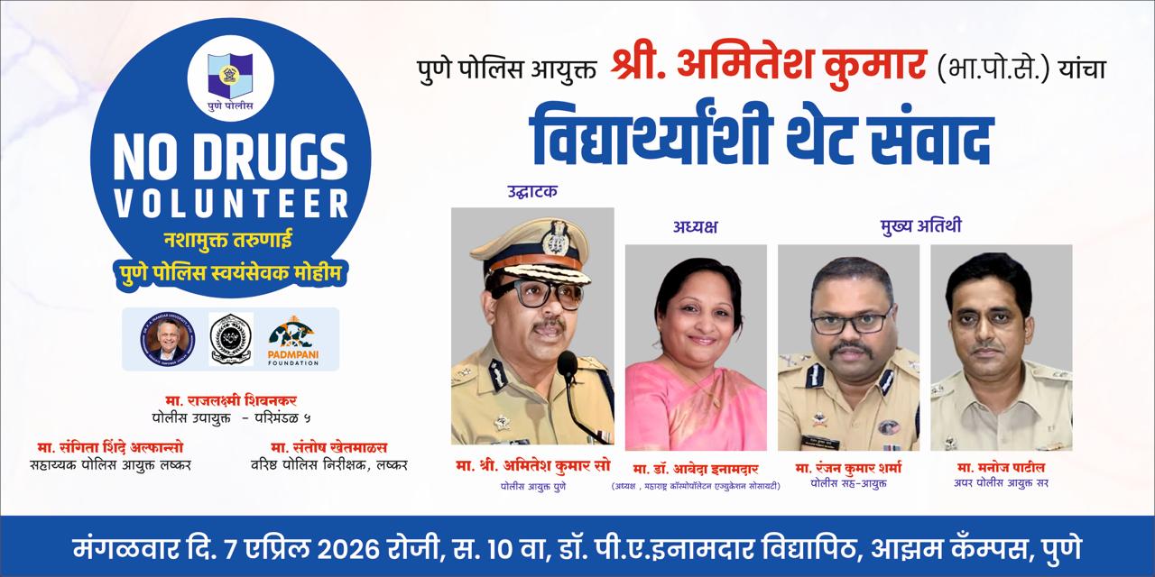 पुणे, : युवकांचा सहभाग आणि संस्थात्मक सहकार्य यांच्या माध्यमातून व्यसनमुक्त भवितव्य घडविण्याकडे महत्त्वपूर्ण पाऊल टाकत पुणे पोलीसांकडून मंगळवार, दि. ७ एप्रिल २०२६ रोजी सकाळी ११ वाजता डॉ. पी. ए. इनामदार विद्यापीठ, आझम कॅम्पस येथे ‘नो ड्रग्स व्हॉलेंटिअर’ अभियानाचे आयोजन करण्यात आले आहे.