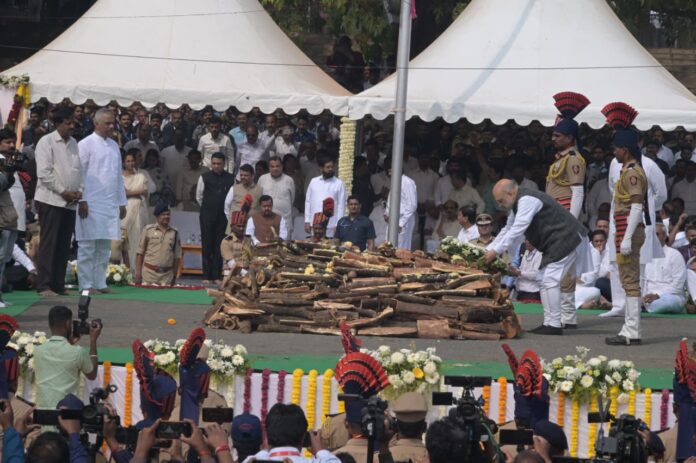पुणे, – उपमुख्यमंत्री अजित पवार यांना आज शोकाकुल वातावरणात शासकीय इतमामात अखेरचा निरोप देण्यात आला. बारामती येथील विद्या प्रतिष्ठानच्या परिसरात त्यांच्यावर अंत्यसंस्कार करण्यात आले. या वेळी केंद्रीय गृहमंत्री अमित शहा, मुख्यमंत्री देवेंद्र फडणवीस, केंद्रीय रस्ते वाहतूक व महामार्ग मंत्री नितीन गडकरी, गोव्याचे मुख्यमंत्री प्रमोद सावंत, महाराष्ट्राचे उपमुख्यमंत्री एकनाथ शिंदे यांनी पुष्पचक्र अर्पण करून अजित पवार यांना श्रद्धांजली वाहिली.