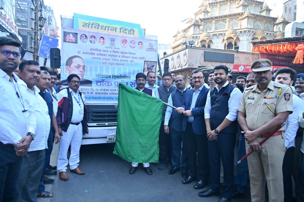 पुणे, – डॉ. बाबासाहेब आंबेडकर संशोधन व प्रशिक्षण संस्था (बार्टी) आणि सहायक आयुक्त समाजकल्याण, पुण्यातील संविधान प्रेमी नागरिक यांच्या संयुक्त विद्यमाने संविधान दिनानिमित्त ‘वॉक फॉर संविधान’ रॅली आयोजित करण्यात आली. या रॅलीचे उद्घाटन विभागीय आयुक्त डॉ.चंद्रकांत पुलकुंडवार यांच्या हस्ते करण्यात आले.