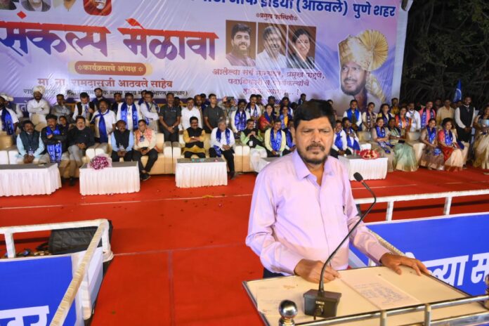 पुणे महानगर पालिकेच्या आगामी निवडणुकीच्या पार्श्वभूमीवर रिपब्लिकन पार्टी ऑफ इंडिया (आठवले) पक्षाच्यावतीने  आश्रम मैदान, डॉ बाबासाहेब आवेडकर महाविद्यालय, नाना पेठ, पुणे येथे ‘संकल्प मेळाव्याचे आयोजन केले होते. यावेळी केंद्रीय सामाजिक न्याय राज्यमंत्री आठवले बोलत होते,  याप्रकरणी उच्च व तंत्रशिक्षण मंत्री चंद्रकांत पाटील, रिपब्लिकन पार्टी ऑफ इंडिया (आठवले) चे पुणे शहराध्यक्ष संजय सोनवणे, शहर प्रभारी शैलेन्द्र चव्हाण, प्रदेश सचिव बाळासाहेब जानराव, परशुराम वाडेकर अशोक कांबळे, अशोक गायकवाड, महिपाल वाघमारे, महेंद्र कांबळे, अशोक शिरोळे, शाम सदाफुले, महिला शहराध्यक्ष हिमाली कांबळे, माजी उपमहापौर सुनीता वाडेकर, विशाल शेवाळे, यांच्यासह पक्षाचे प्रमुख नेते मेळाव्याकरीता उपस्थित होते.