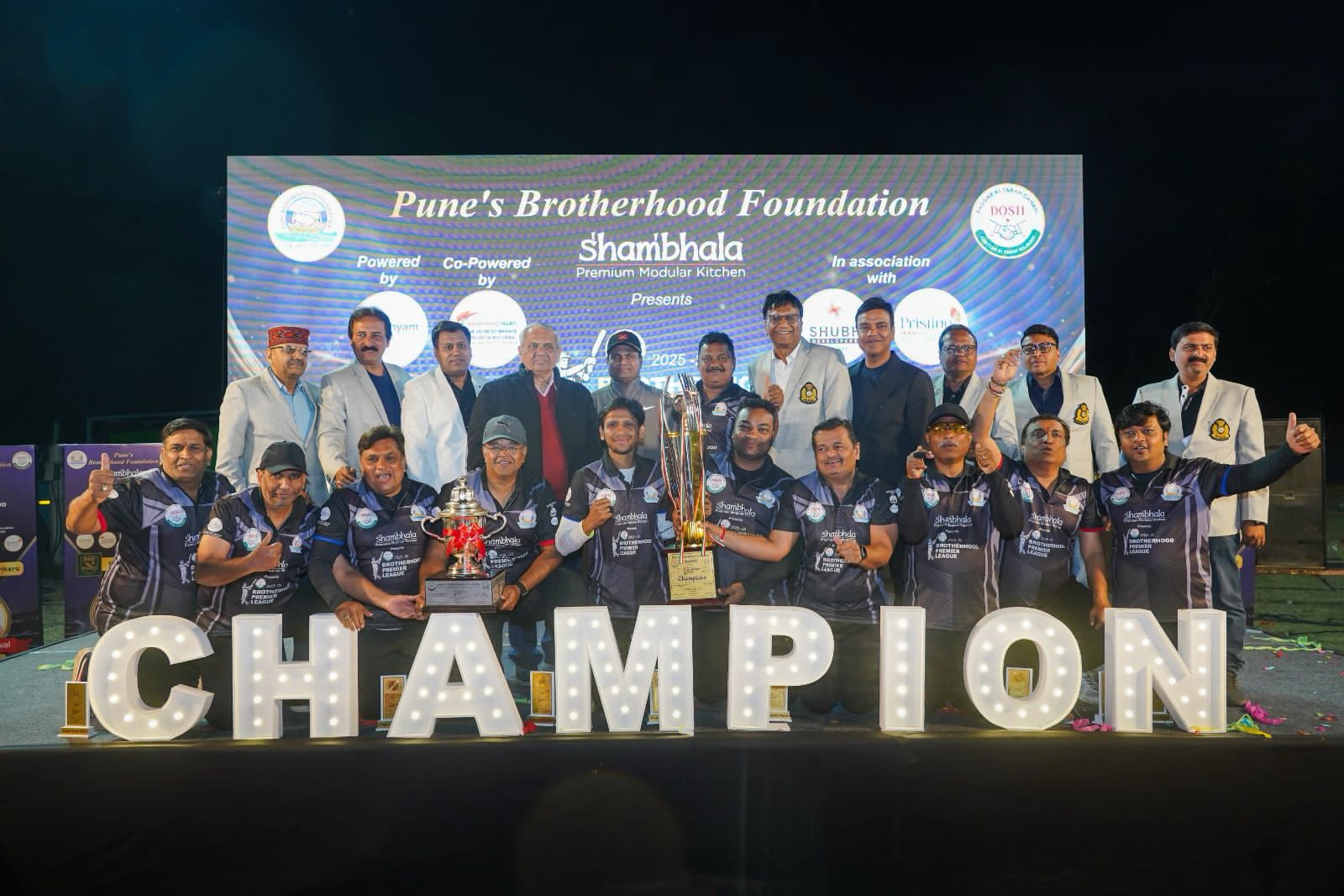 पुणे: पुणे ब्रदरहुड फाउंडेशनच्या वतीने आयोजित करण्यात आलेली शंभला ब्रदरहुड प्रीमियर लीग (BPL) क्रिकेट स्पर्धा अत्यंत उत्साहात आणि दिमाखात यशस्वीपणे संपन्न झाली. ही स्पर्धा नुकतीच एएफके खडकी येथील मैदानावर दिवस – रात्र प्रकाशझोतात पार पडली. या स्पर्धेत सनराईज गणराज जायंट्स संघाने पुरुष गटाचे विजेतेपद पटकावले, तर बी अँड बी बॅशर्स उपविजेते ठरले. महिला गटात पीकेजी येरवडा स्ट्रायकर्स विजेते, तर पीकेजी प्राधिकरण पँथर्स उपविजेते ठरले.