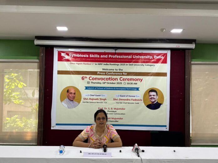 पुणे, – : सिंबायोसिस स्किल्स अँड प्रोफेशनल युनिव्हर्सिटी (SSPU), पुणे, आपल्या ६ व्या दीक्षांत समारंभाची अभिमानाने घोषणा करत आहे. हा समारंभ १६ ऑक्टोबर २०२५ (गुरुवार) रोजी, सकाळी १०. ३० वाजता सिंबायोसिस स्किल्स अँड प्रोफेशनल युनिव्हर्सिटी कॅम्पस, पुणे-मुंबई एक्सप्रेसवे, किवळे, पुणे येथे आयोजित करण्यात आला आहे. या कार्यक्रमात स्कूल ऑफ डिफेन्स अँड एरोस्पेस टेक्नॉलॉजी या नव्या विभागाचे उद्घाटन मा. राजनाथ सिंह, संरक्षण मंत्री, भारत सरकार यांच्या हस्ते होणार आहे. हा विभाग भारताच्या वाढत्या संरक्षण नवोन्मेष क्षेत्राला पाठबळ देत “आत्मनिर्भर भारत” या संकल्पनेला पुढे नेणारा ठरेल.